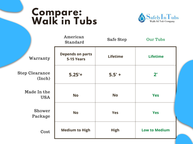 The warranty is an important factor in deciding which walk in tub to buy. Most will have lifetime warranty on the tub itself, but beware of phrases like “designed and engineered in the US”. Some brand name manufactures cut costs by importing tubs from and smaller parts from China and assembling them in the US.